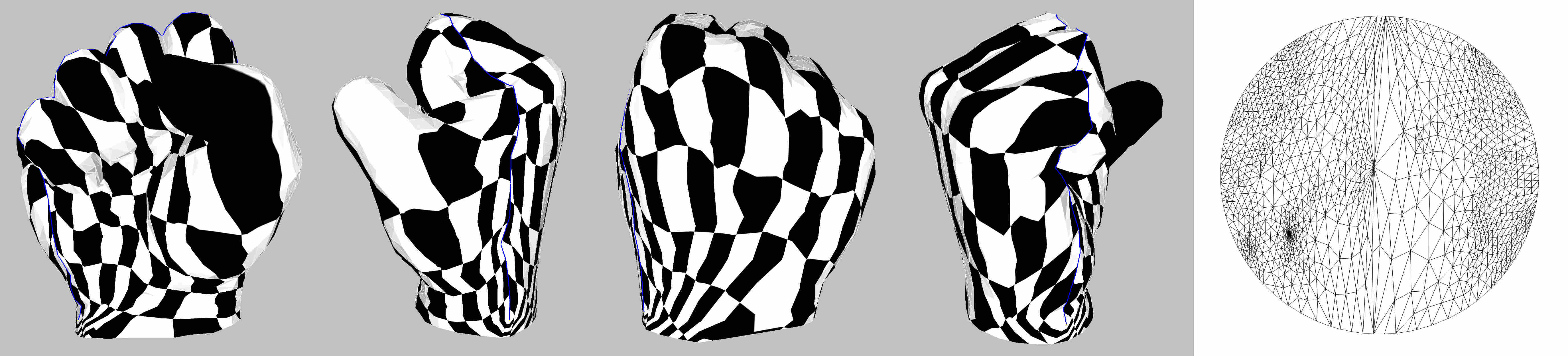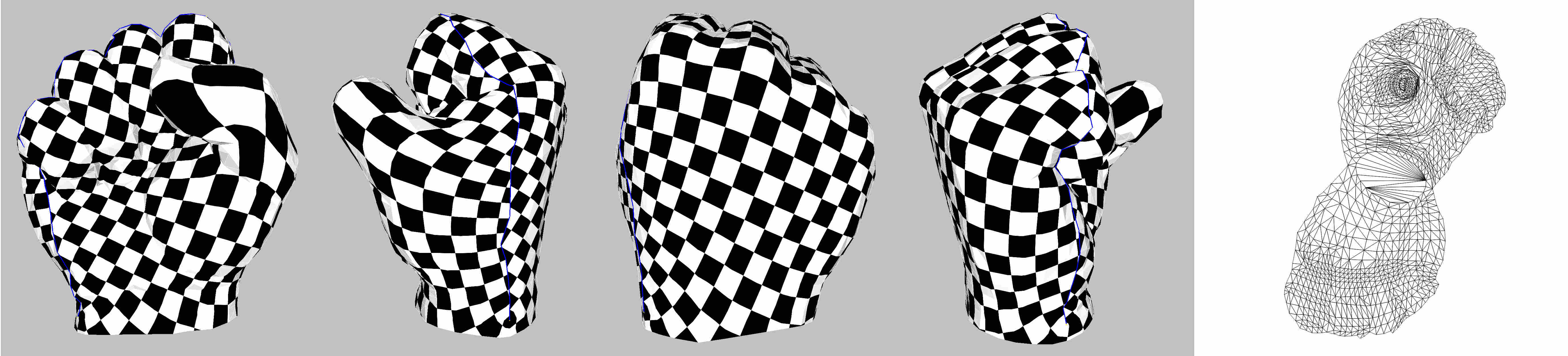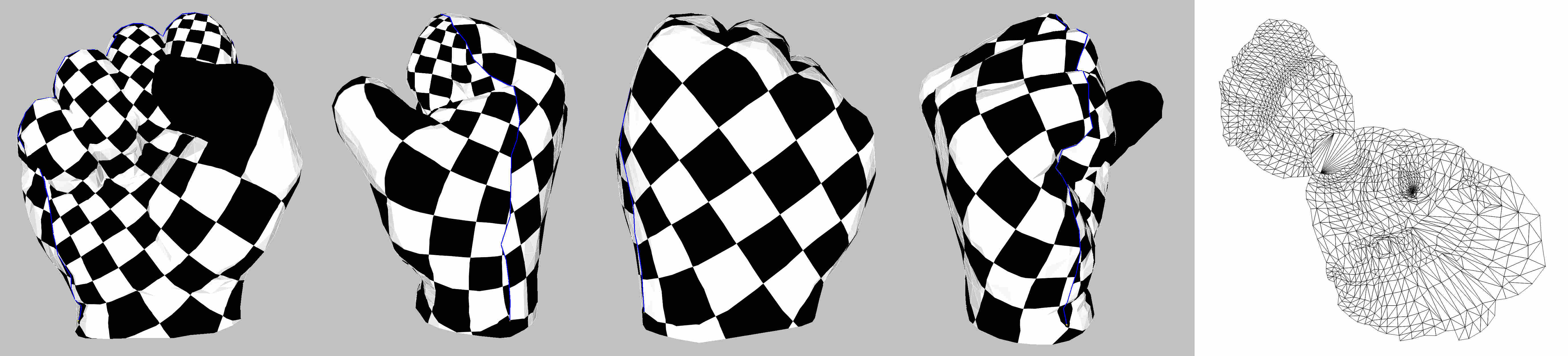 fig__Surface_mesh_parameterizationfigARAP As Rigid As Possible parameterization (the blue line depicts the cut graph). Rightmost: parameter space.