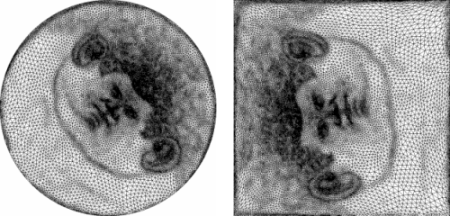fig__Surface_mesh_parameterizationfigcircular_border Left: Julius Cesar mask parameterization with Authalic/circular border. Right: Julius Cesar mask's image with Floater/square border.