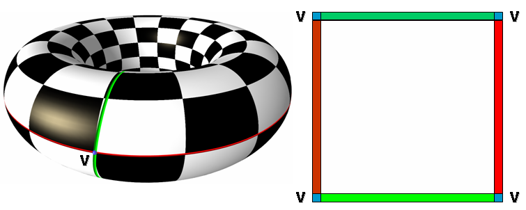 fig__Surface_mesh_parameterizationfigOrbifold Type IV Orbifold Tutte Embedding. The (four) base cones are shown in green and the virtual cut is traced in blue. Rightmost: parameter space.