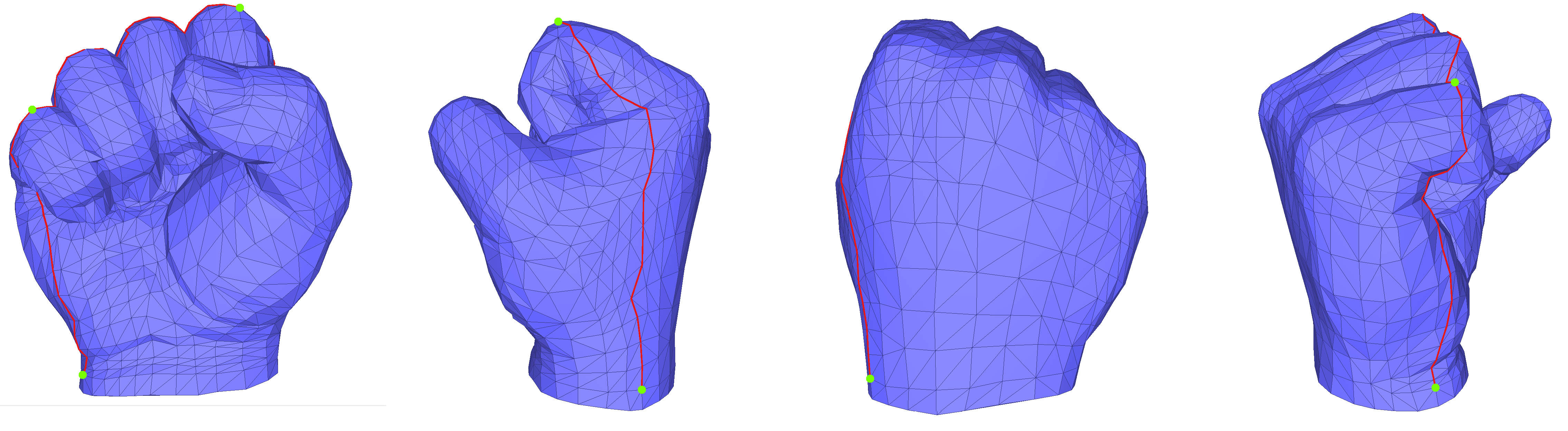 Illustrations of the different methods are obtained with the same input model, the hand model, shown in Figure fig__Surface_mesh_parameterizationfigbase. The hand is a topological sphere, and a Seam_mesh is used to cut it into a topological disk. In Figure fig__Surface_mesh_parameterizationfigbase, the seam is traced in red and the four cones used for Orbifold Tutte Parameterization (Section Orbifold Tutte Embeddings) are marked with green dots.
