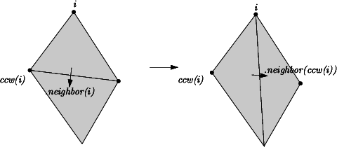 Each edge has two implicit representations : the edge of a face f which is opposed to the vertex indexed i, can be represented as well as an edge of the neighbor(i) of f. See fig__TDS_2D_Fig_neighbors1.