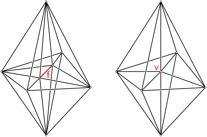 v is used to triangulate one of the two half-spheres of \( \mathbb{S}^{d+1}\) ( \( v\) is added as \( (d+2)^{th}\) vertex to all full cells) and star is used to triangulate the other half-sphere (all full cells that do not already have star as vertex are duplicated, and star replaces v in these full cells). The indexing of the vertices in the full cell is such that, if f was a full cell of maximal dimension in the initial complex, then (f,v), in this order, is the corresponding full cell in the updated triangulation. A handle to v is returned (see Figure fig__triangulationfiginsertincreasedim).