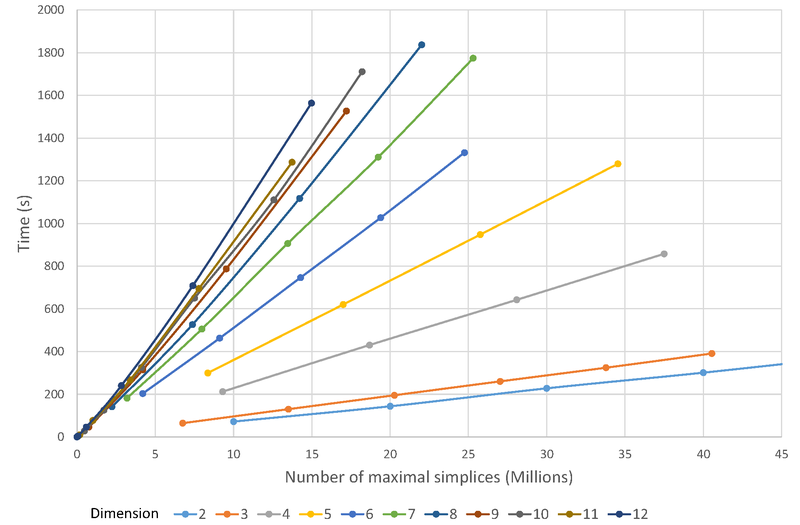 fig__triangulationfigbenchmarkchart Running time wrt. number of maximal simplices, for dimensions for 2 to 12.