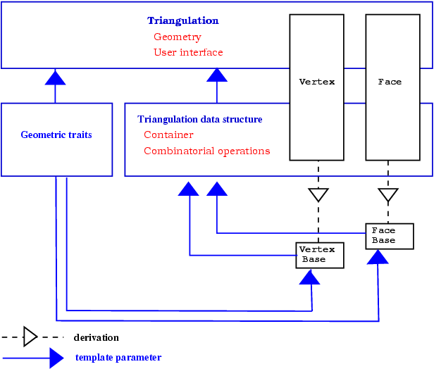 To insure flexibility, the triangulation data structure is templated by the vertex and face base classes. Also since incidence and adjacency relations are stored in vertices and faces, the base classes have to know the types of handles on vertices and faces provided by the triangulation data structure. Thus the vertex and face base classes have to be themselves parameterized by the triangulation data structure, and there is a cyclic dependency on template parameter.